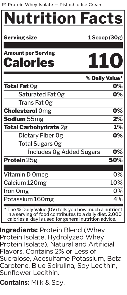 Built for pure performance, each scoop of R1 Protein Whey Isolate delivers 25 grams of nutritionally complete protein with single-digit carbs and 1 gram of fat or fewer. No shortcuts. Just highly concentrated nutrition to support your active lifestyle. †^^