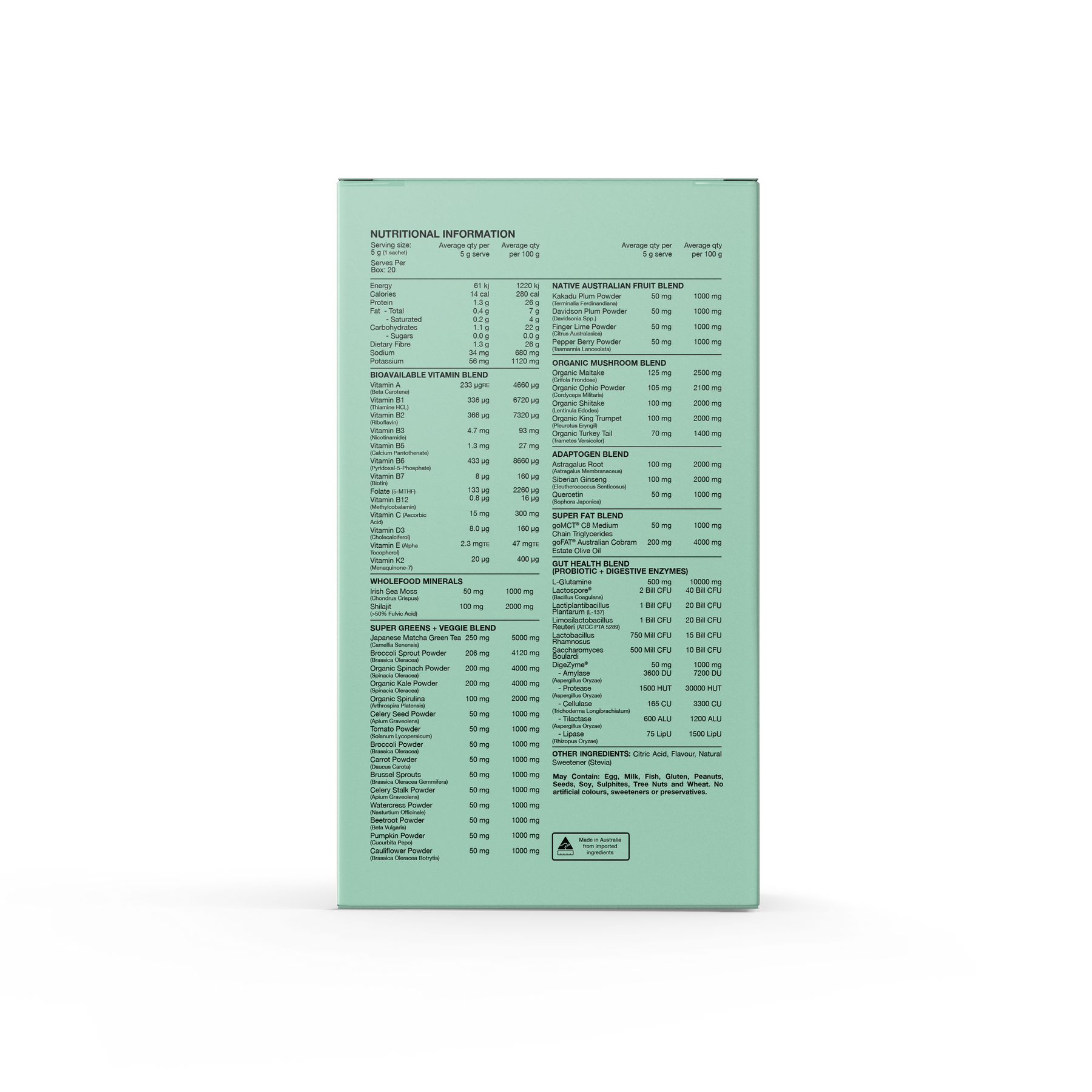 15+ nutrient-rich greens and veggies, including spinach, kale, broccoli sprouts, spirulina, and beetroot - plus a powerhouse blend of native Australian superfruits (Kakadu Plum, Davidson Plum, Finger Lime, Pepperberry) for potent antioxidants, Vitamin C, and skin, gut, and immune support.